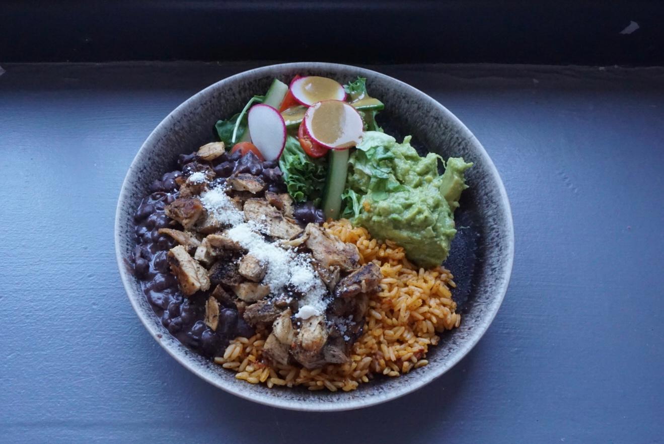 Your choice of protein over rice and beans. guacamole and small side salad.